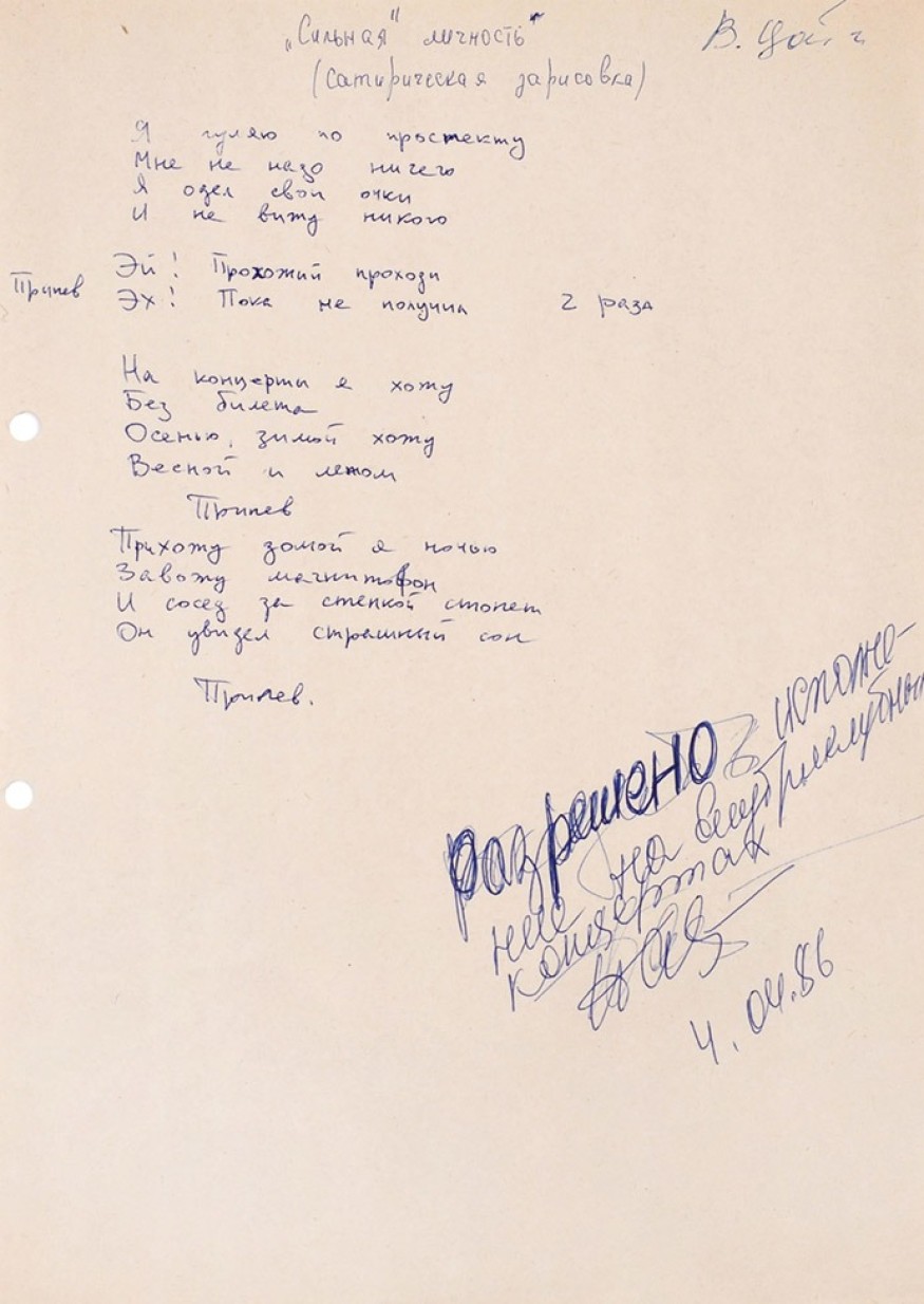 Рукопись была написана в апреле 1986 года и имеет визу Нины Барановской, разрешающую исполнение песни на внутриклубных концертах. Интересно, что тогда композиция называлась «Сильная личность» – возможно, это было сделано, чтобы обойти цензуру.